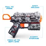 تفنگ فلوکس از برند Zuru، یک تیر رو در اسلحه و دو تیر رو در خشاب خودش جای میده و اینطوری شما میتونید تفنگتون رو قبل از حریفان آماده کنید. برای شلیک کافیه که تیر رو در اسلحه قرار داده، گلنگدن رو به عقب بکشید و ماشه رو فشار بدید تا یک تیر به سمت هدف پرتاب شود. این تفنگ با طرح گرافیتی جدید و جذابی که داره رقابت تو صحنهی نبرد رو براتون هیجانانگیزتر میکنه.