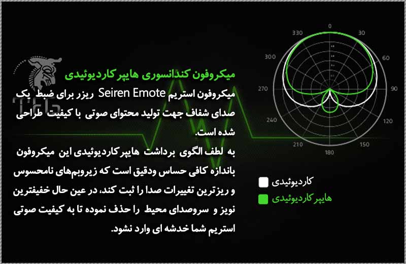 میکروفون استریم ریزر Razer Seiren Emote از نظر کیفیت صدا و دقت آن، جزو بهترین میکروفن‌های استریم حال‌حاضر است و با توجه به الگوی پیکاپ هایپرکادیوئیدش، می‌تواند تقریباً همه‌ی صداهایی که در اطراف‌تان می‌شنوید را فیلتر کند، تا مخاطبان شما فقط صدای شما را، آن هم با کیفیت و دقت بسیار بالا، بشنوند. احتمالاً اسم الگوی پیکاپ قطبی یا کاردیوئید به‌گوش‌تان خورده و خبر خوب این است که کپسول هایپرکاردیوئید این میکروفن، از آن الگو هم متمرکزتر عمل می‌کند و برای داشتن استریمی با صدای بدون نویز و شفاف، می‌توانید کاملاً روی آن حساب کنید.