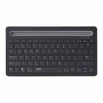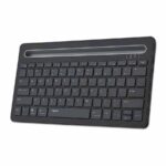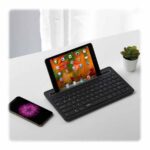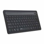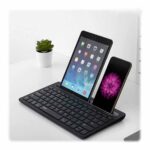 سوییچ بین آنها هم بهسادگیِ هرچهتمام انجامپذیر است، کافیست کلیدهای FN+1/2/3 را فشار دهید. خوشبختانه از این کیبورد میتوانید برای گوشی، تبلت، تلویزیون هوشمند و کامپیوتر استفاده کنید. در بالای آن هم محلی برای قرار دادن تبلت و گوشی تعبیه شدهاست. این مکان حداکثر از یک تبلت 9.7 اینچی که بهصورت افقی قرار داده میشود پشتیبانی میکند، اما میتوانید دو تبلت یا یک تبلت و یک گوشی را بهصورت ایستاده یا عمودی روی آن قرار دهید.