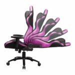 یک اهرم کوچک که در سمت راست صندلی قرار دارد (جایی که تکیه گاه و بالشتک صندلی به هم میرسند) که به شما این امکان را میدهد که پشتی صندلی را از جهت تقریباً عمودی، در تمام مسیر از جلو به عقب تنظیم کنید. بالشتک صندلی دارای طرح لایهای است، با یک بخش توپر در مرکز که توسط بخشهای سوراخدار در کنارهها احاطه شده است. قسمتهای بالشتک سمت چپ و راست کمی به سمت بالا زاویه دارند تا شما را در مرکز صندلی نگه دارند. این قسمت دوباره ترکیبی از مواد مشکی و بنفش را مانند پشتی صندلی نشان میدهد.