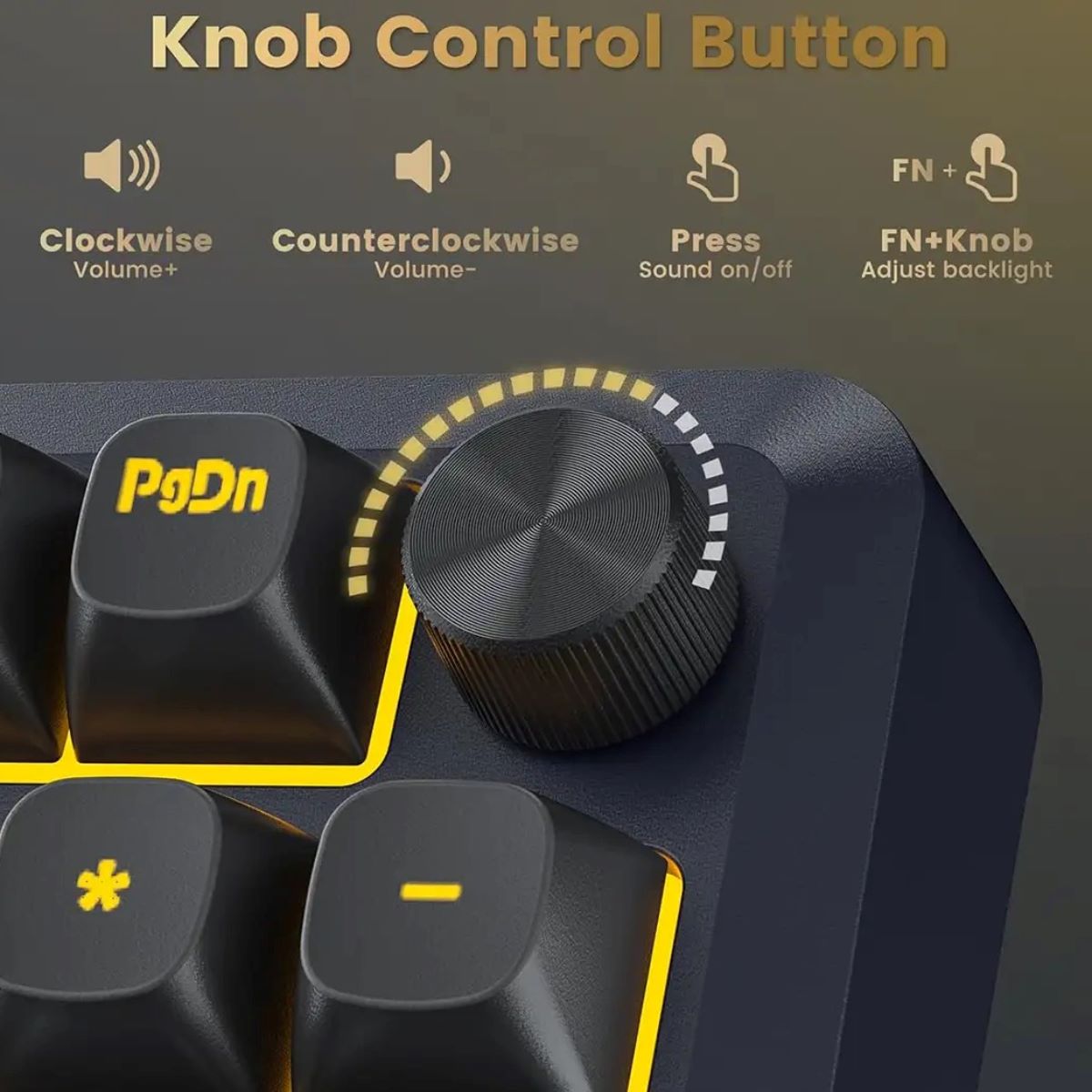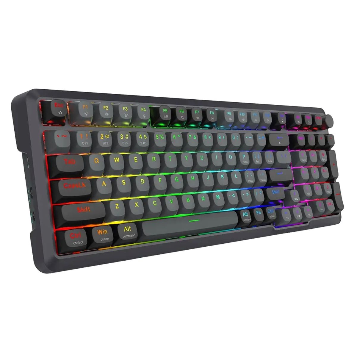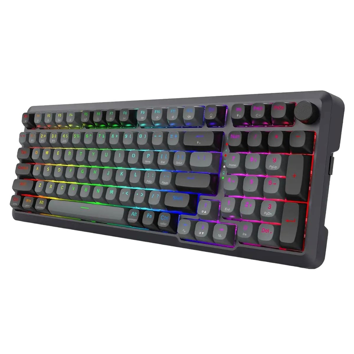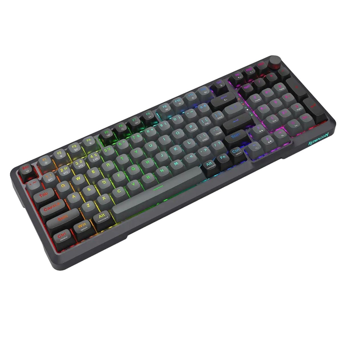 نورپردازی RGB این کیبورد، دنیای رنگها را به میز کارتان میآورد. شانزده حالت نورپردازی متنوع و افکتهای هماهنگ با ریتم موسیقی، به کمک نرمافزار اختصاصی Redragon بهطور کامل قابل شخصیسازی هستند تا دقیقاً همان جلوهای را خلق کنید که با حال و هوای کار یا بازی شما هماهنگ باشد. همچنین یک دکمه کنترل چندمنظوره روی کیبورد قرار گرفته که از طریق آن میتوانید شدت نور پسزمینه، حجم صدا و حالتهای نورپردازی را سریع و آسان تغییر دهید؛ جزئیاتی که نشان میدهد Redragon تا چه حد به تجربه کاربر اهمیت داده است.