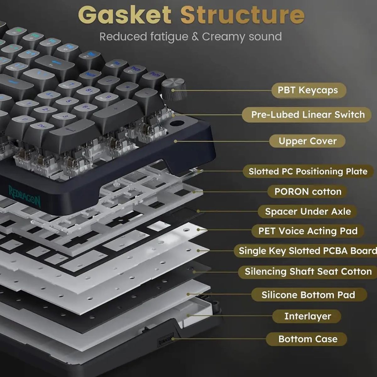 یکی از نقاط قوت این کیبورد، ساختار گسکت است که با طراحی هوشمندانه و لایههای سیلیکونی و عایق صدا، علاوه بر بهبود مقاومت و پایداری بدنه، صدای برخورد شفتها با صفحه موقعیتیابی را به حداقل میرساند. همین ویژگی، سکوت و حس استحکام کمنظیری را هنگام تایپ یا بازی طولانیمدت به ارمغان میآورد و به تجربهای روان و خالص تبدیل میشود.