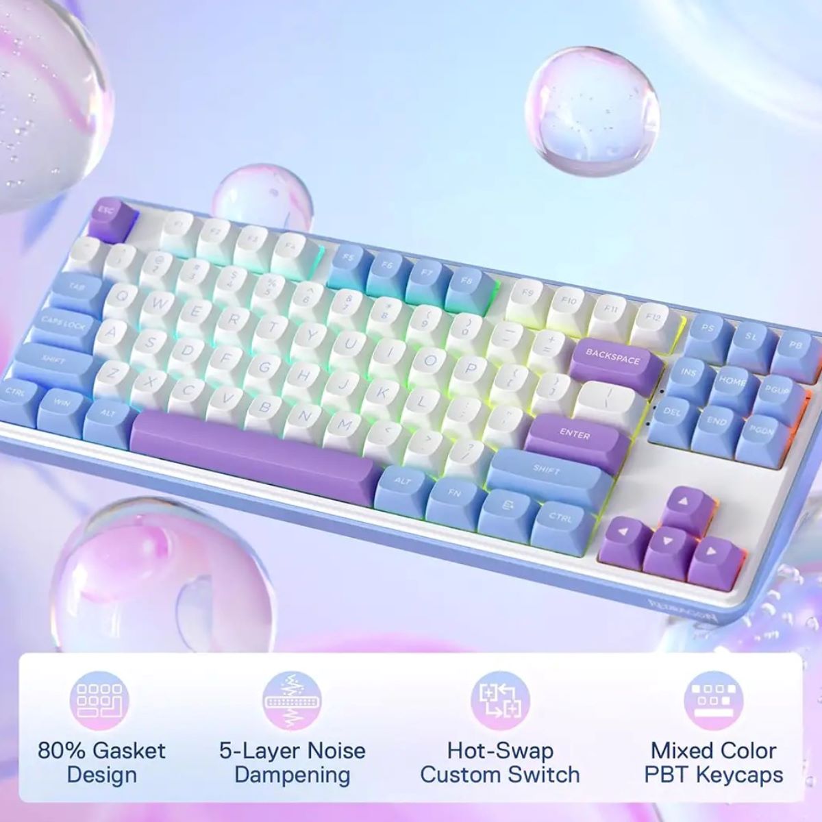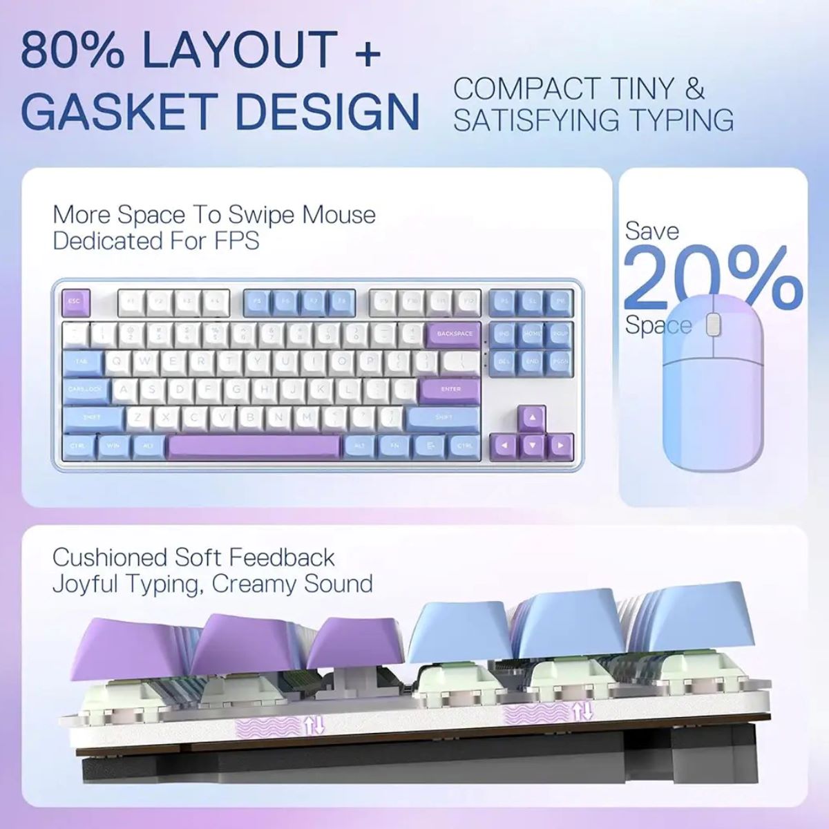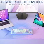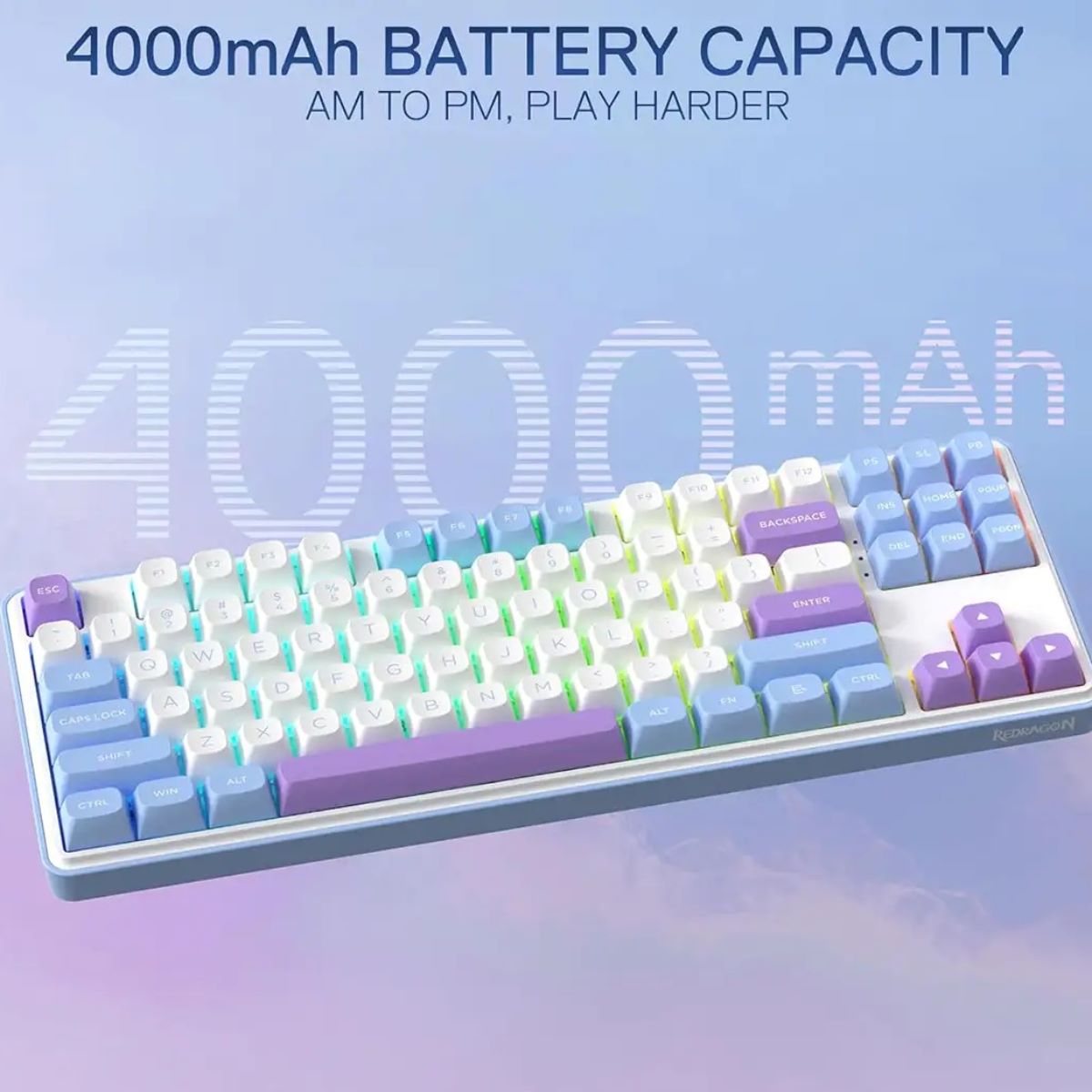 Redragon K707 WBP با بهرهگیری از طراحی 80 درصدی (TKL)، فضای میزتان را بهینه میکند و در عین حال دسترسی کامل به کلیدهای ضروری را فراهم میسازد. استفاده از رنگهای سفید، آبی و بنفش جلوهای منحصربهفرد به آن میدهد. جنس کلیدها از پلاستیک PBT با دوام بالا ساخته شده که در برابر ساییدگی مقاوم است. وزن 1.2 کیلوگرمی کیبورد، پایداری مناسبی روی میز فراهم میکند.