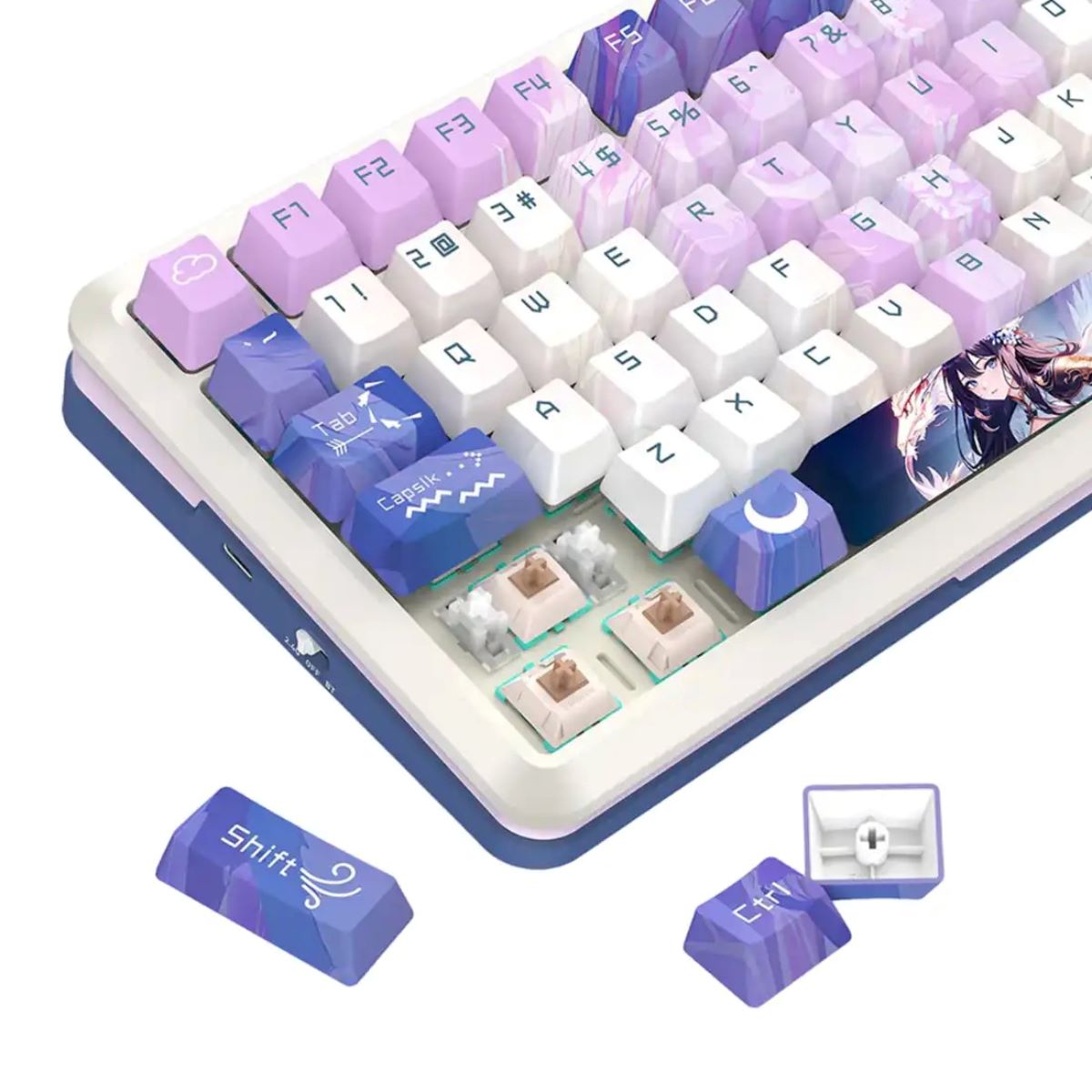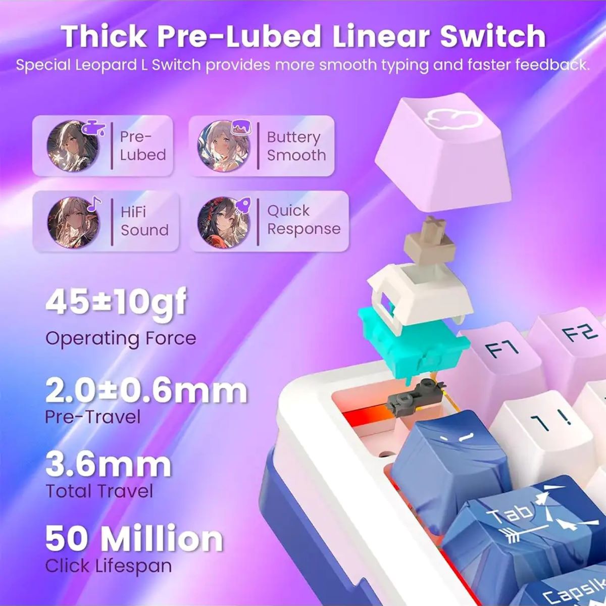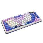 ترکیب رنگهای سفید، آبی و صورتی در یک قاب مدرن و زیبا، این کیبورد را از سایر محصولات بازار متمایز میکند. تم انیمهای نهتنها برای علاقهمندان به ژاپن و فرهنگ بصری آن جذاب است، بلکه به میز کار یا میز بازیتان رنگ و روحی تازه میبخشد. این ظاهر منحصربهفرد باعث میشود K708AK PRO فقط یک ابزار نباشد، بلکه بخشی از استایلتان باشد.